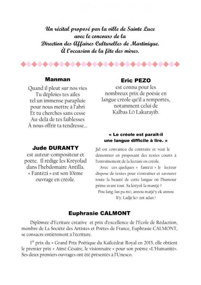 La ville de Sainte Luce, avec le concours de la Direction des Affaires Culturelles de Martinique convient la population, et les mamans au récital "Lawonn bèl pawol pou fèt manman ", ce Vendredi 27 Mai, à partir de 18H, dans la salle d'honneur de la Mairie.