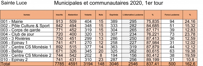 Le Dimanche 15 mars 2020, la liste "l'Alternative Lucéenne" a remporté les élections municipales de Sainte Luce, avec 2546 voix, soit 83,7\% des suffrages exprimés. La Liste " Force Lucéenne " se place en seconde position avec 500 voix, soit 16,2\% des suffrages.