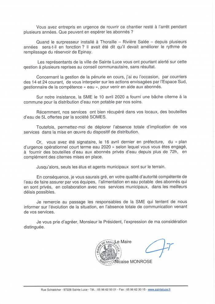 Actualités & News > COUPURE D'EAU / Courrier adressé au Président de l’Espace Sud