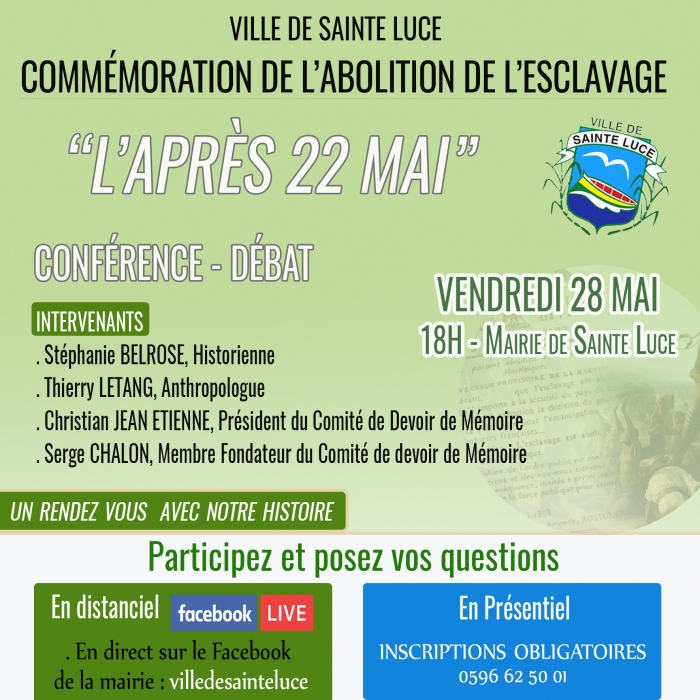 Dans le cadre des manifestations de Commémoration de l'Abolition de l'Esclavage, la Ville de Sainte Luce vous convie à échanger sur " l'Après 2 ... |