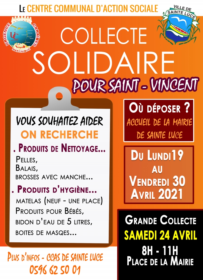 La Ville de Sainte Luce et Urgences Caraïbes organisent une collecte de produits au profit des sinistrés de Saint – Vincent.