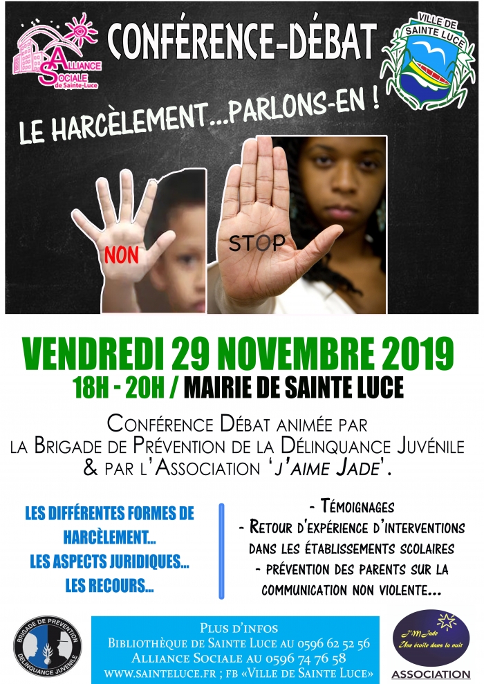 Vendredi 29 Novembre…Le harcèlement…Parlons-en ! La ville de Sainte Luce et l’association l’Alliance Sociale, vous convient le Vendr ... |