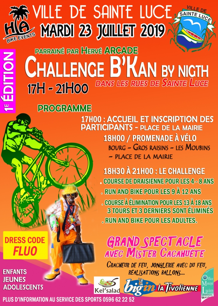 Enfants, jeunes, adolescents, adultes, en famille…la Ville de Sainte Luce et Hervé ARCADE, vous convient au « CHALENGE B’KAN BY NIGHT », ce ...