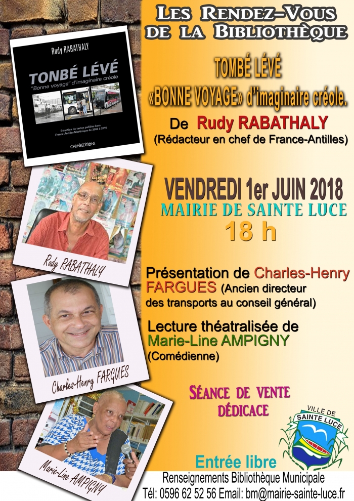 La Ville de Sainte Luce, convie la population à la présentation de « Tonbè Lévé, Bonne Voyage d’imaginaire créole », de Rudy Rabathaly ...