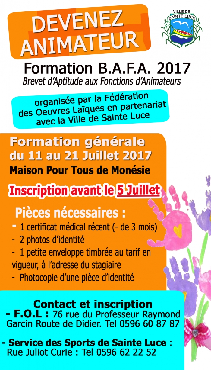 La Fédération des Œuvres Laïques en partenariat avec la ville de Sainte Luce vous propose une formation B.A.F.A. (session générale) du mardi ...