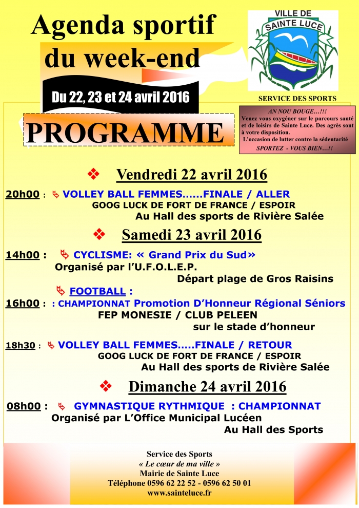 Retrouvez l'agenda sportif du week end du 22,23 et 24 Avril 2016.
