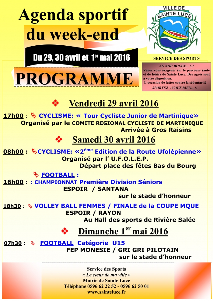 Retrouvez l'agenda sportif du week end du 29, 30 Avril & 1er Mai 2016.