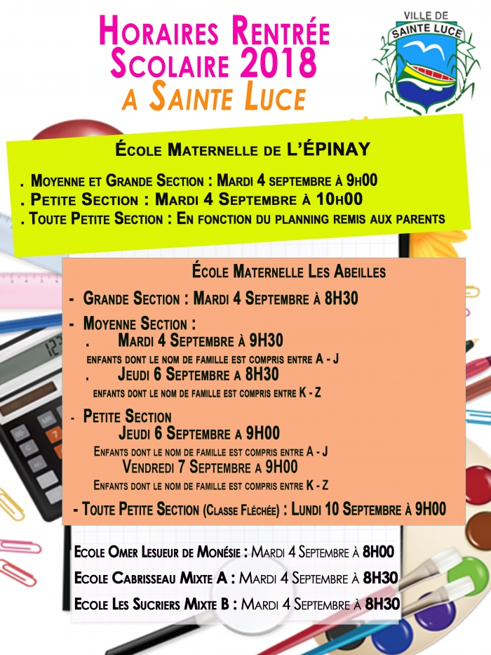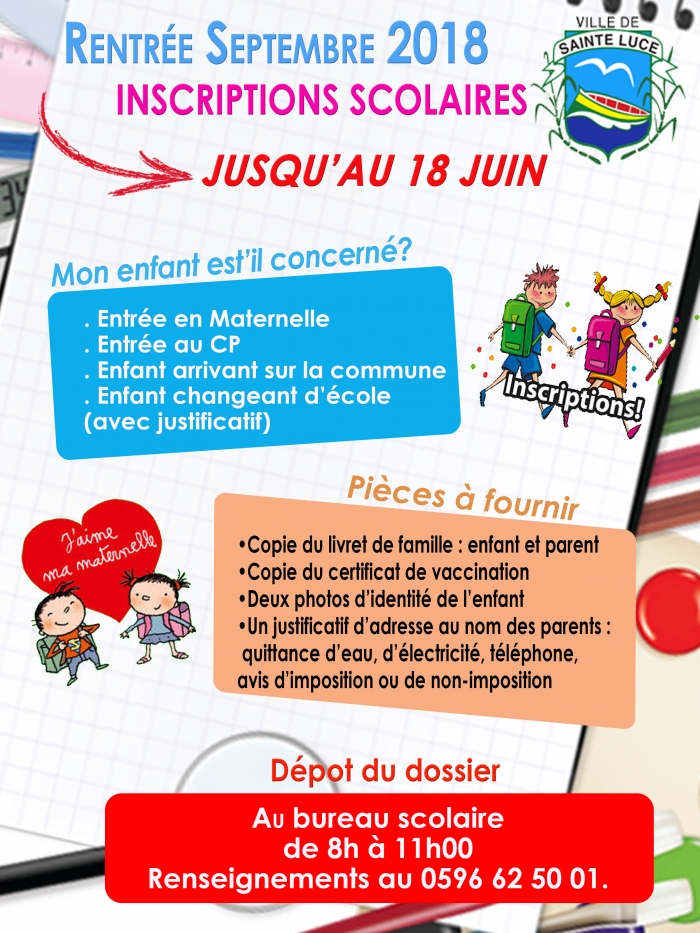 La Ville de Sainte-Luce, informe les parents d’élèves que les inscriptions scolaires pour la rentrée scolaire 2018-2019, se déroulent jusqu†...