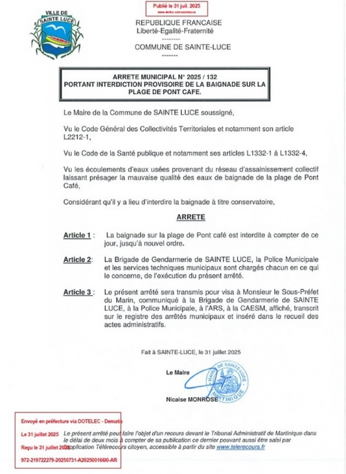 INTERDICTION PROVISOIRE DE LA BAIGNADE SUR LA PLAGE DE PONT CAFE