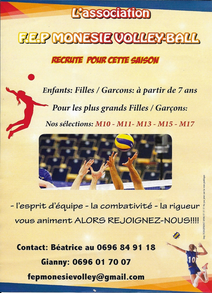 Vous souhaitez pratiquer du Volley Ball, l'association FEP Monésie reprend ses activités. Pour plus d'informations, contactez Béatrice et Gianny ...