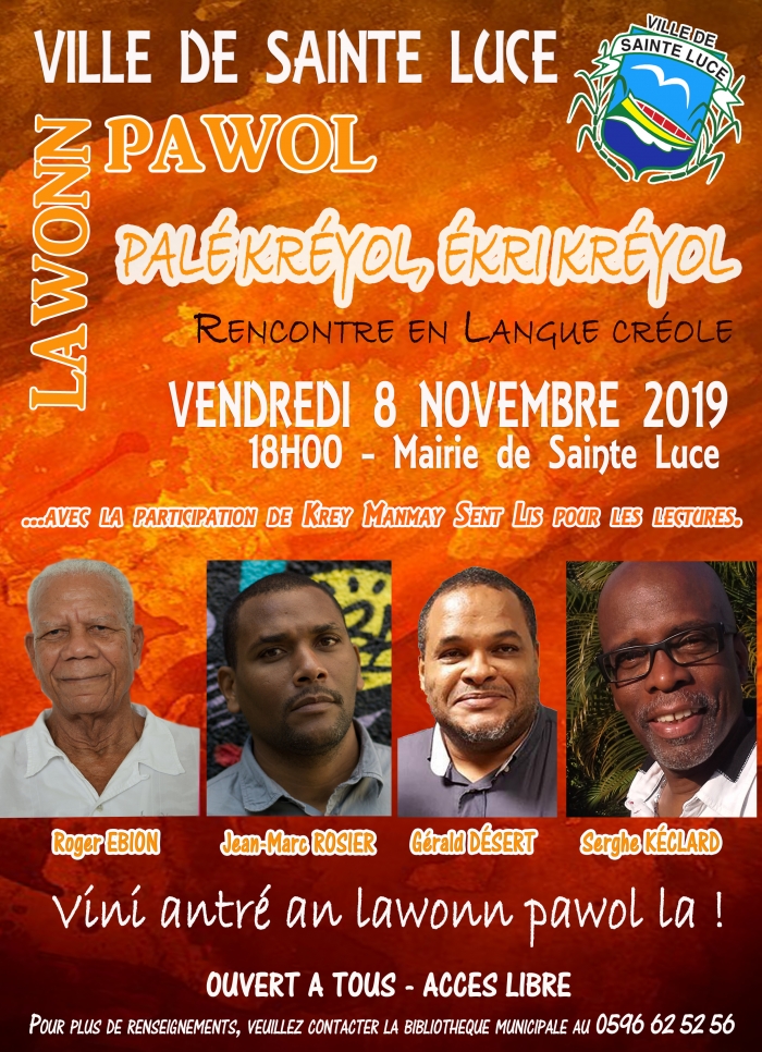 La ville de Sainte Luce convie la population, à une soirée "Lawonn pawol ", ce Vendredi 8 Novembre, à partir de 18H, à la salle d'honneur de la ...