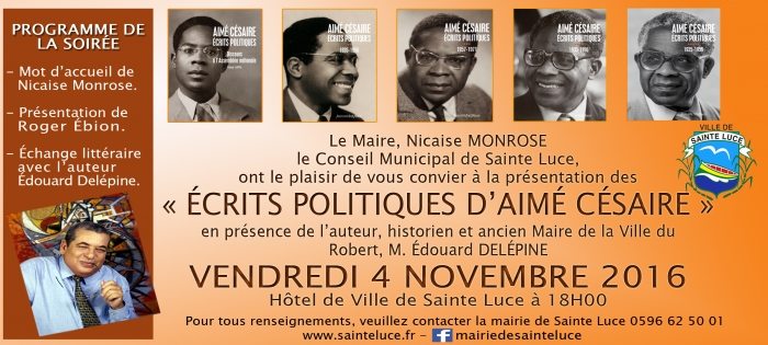 Édouard Delépine va présenter les "ÉCRITS POLITIQUES D'AIMÉ CÉSAIRE", à partir de 18H00, à l’hôtel de Ville de Sainte Luce.