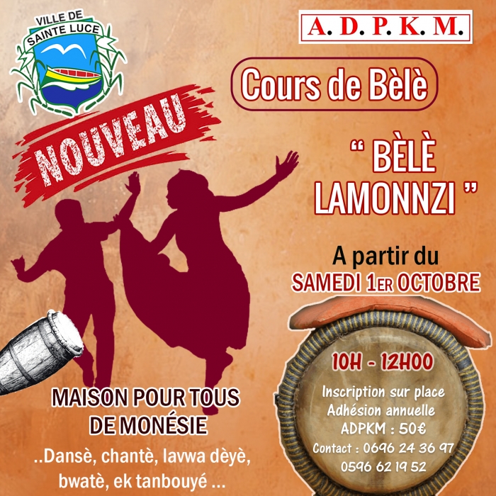 La Ville de Sainte Luce et l’ADPKM mettent en place des cours de bèlè, à partir du Samedi 1er Octobre. Les cours auront lieu tous les Samedis, ...