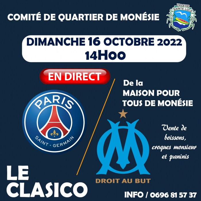 Le Comité de quartier de Monésie et la Ville de Sainte Luce vous invitent à suivre ce Dimanche 16 Octobre, "El Clasico" entre le PSG et l'OM ...