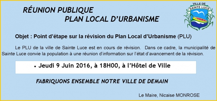 Dans le cadre de la révision du PLU, la municipalité de Sainte Luce, convie la population à une réunion d'information, le Jeudi 9 Juin 2016, à ...